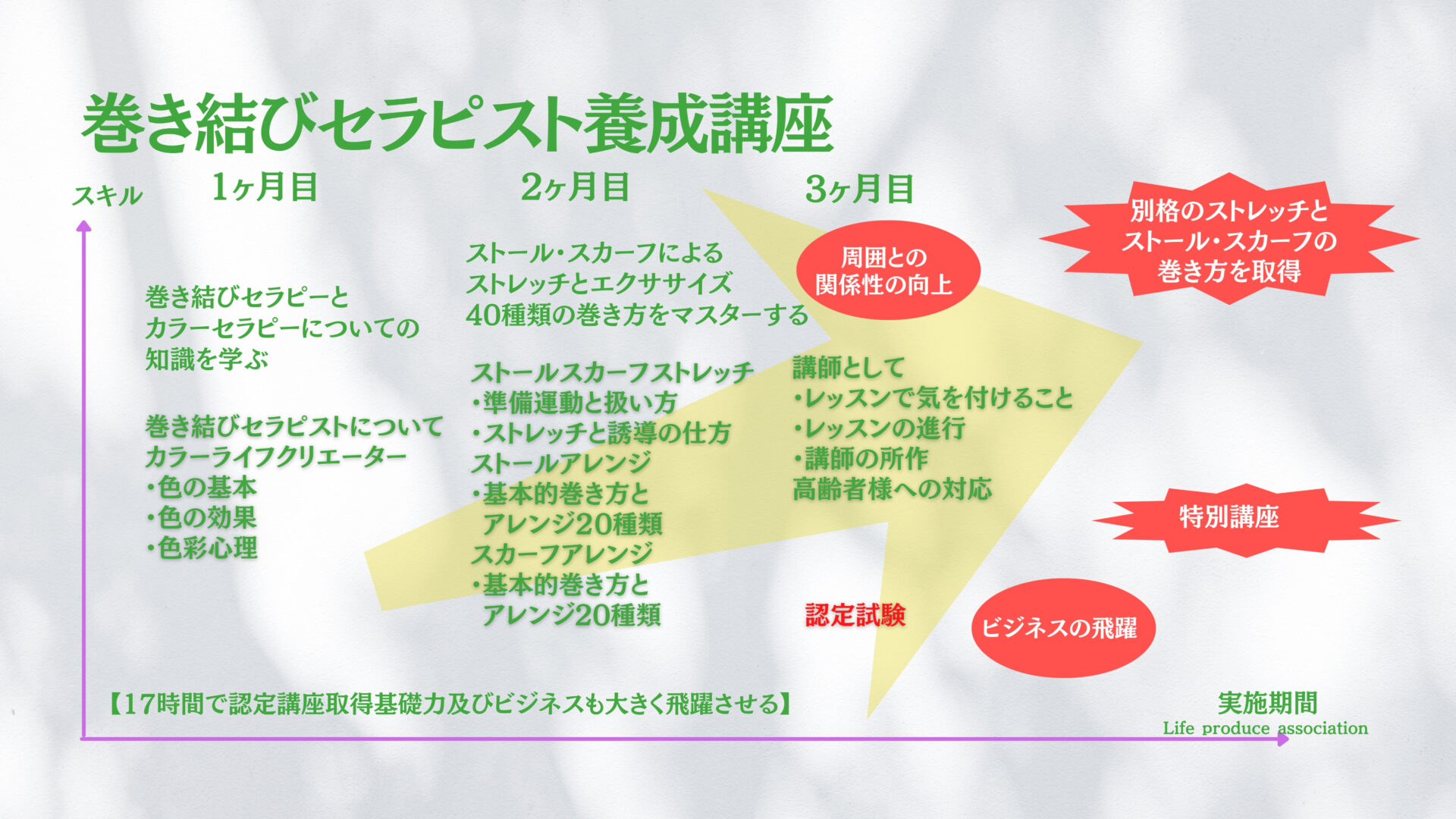 「巻き結びセラピスト養成講座」は、ストールやスカーフを使った独自のメソッドを通して、内面からの美しさと外見の印象力、そして周囲との良好な関係性を育むセラピー技術を身につける講座です。